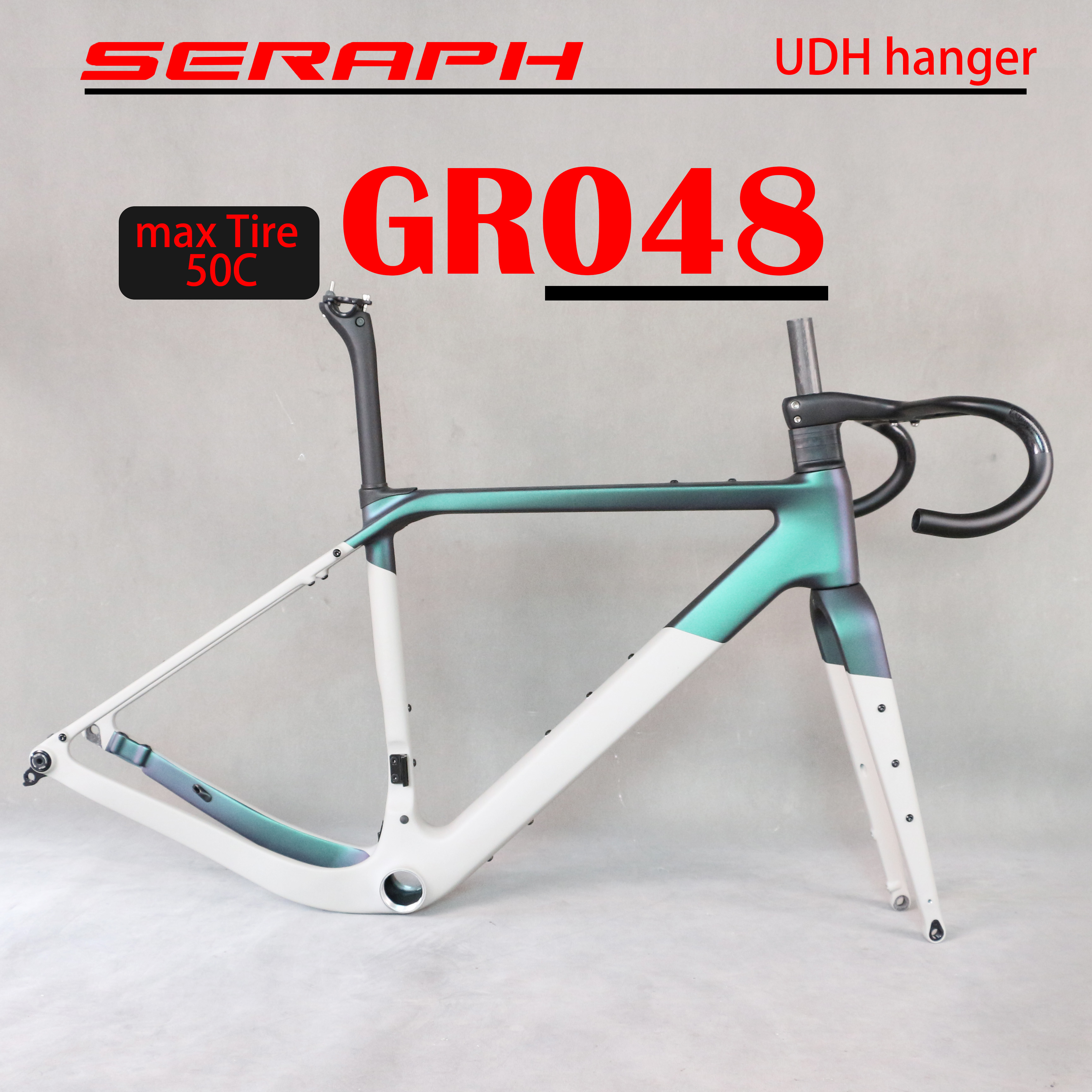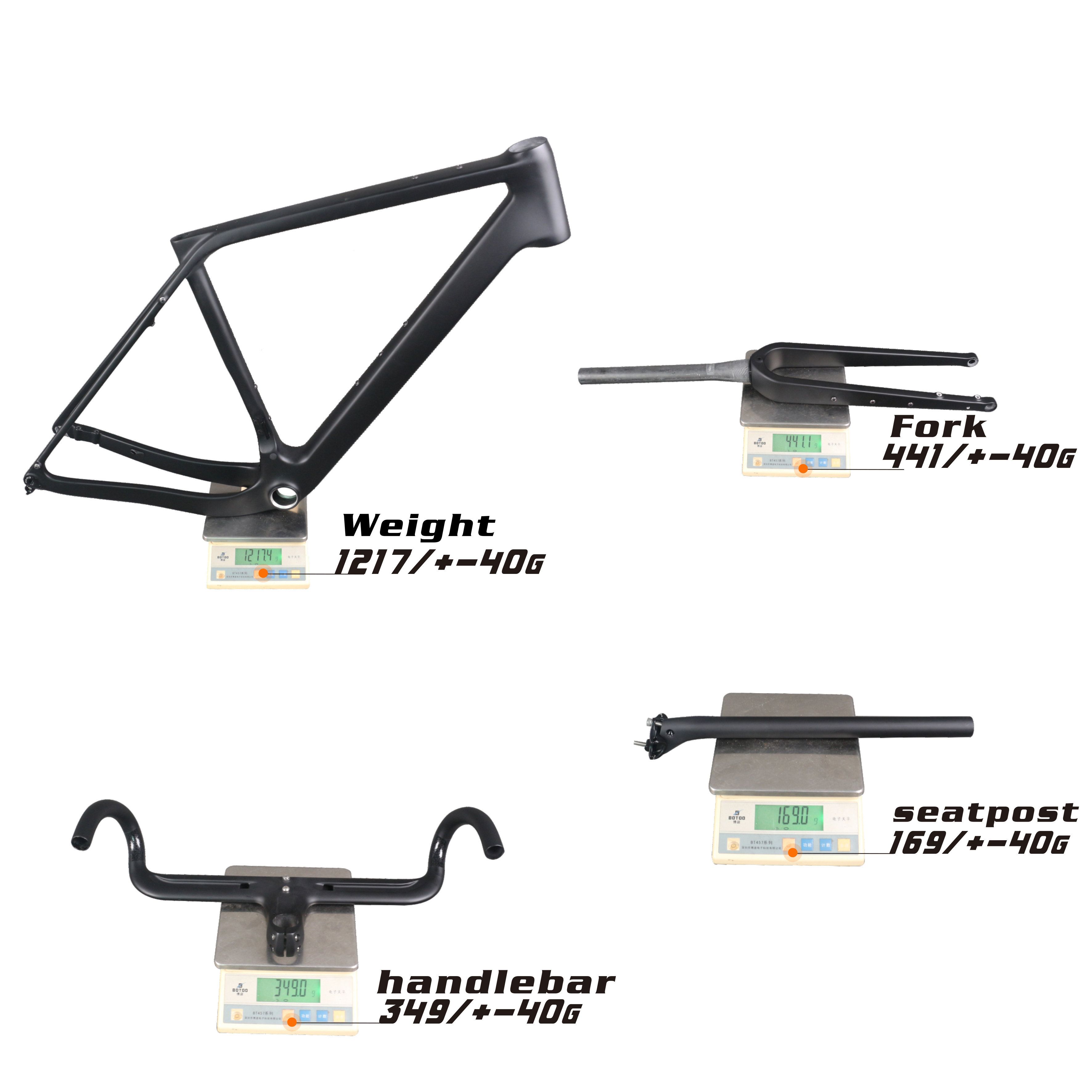 Weight: Frame 1200g +/-60g, Fork 450+/-15g, Handlebar 380+/-20g, Seatpost 205+/-10g.